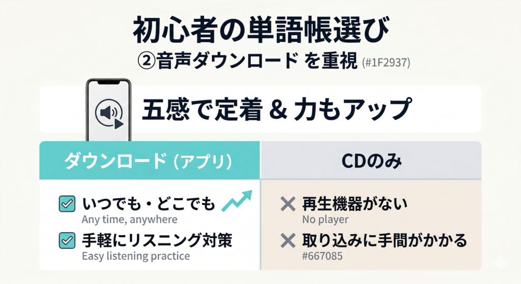 英語初心者が英単語帳を選ぶ際の2つめのポイントは、音声がダウンロードできることです。