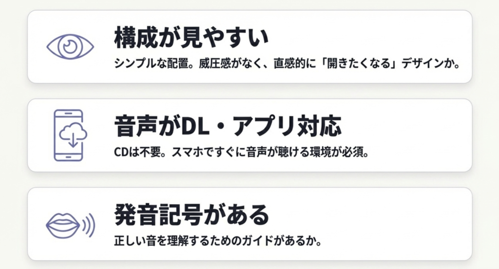 厳選した単語帳3つをお伝えする前に、英語学習初心者の方が単語帳を選ぶ際のポイントを見ていきましょう。