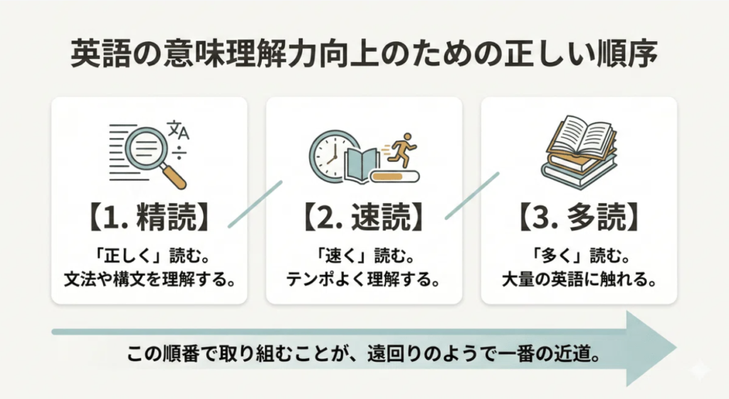 詳しい順番は別の記事でまとめていきますが、精読→速読→多読という順で進めていくことが必要になります。