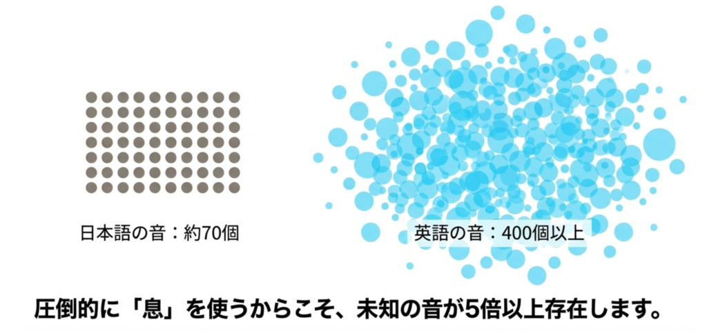 日本語では、この息を使うような組み合わせの音 (母音と子音の組み合わせ) は約70個程度と言われているのに対し、英語では400個以上の組み合わせがあると言われているからです。