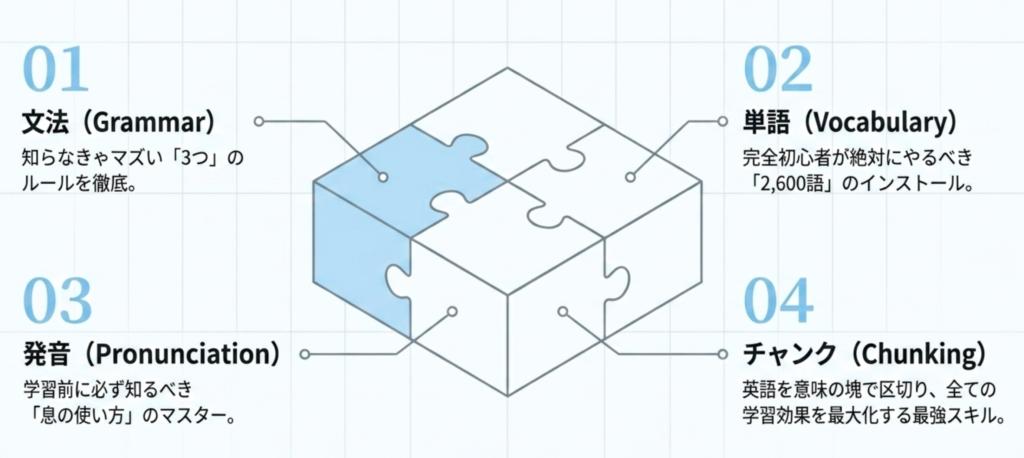 そしてこれからの英語学習の効果を最大化する「チャンク」についても基礎の段階でインプットしていく必要があります。