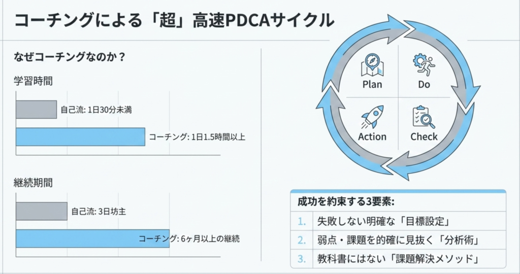 1日30分も学習が続かなかった生徒さんが、1日1.5時間以上、6ヶ月以上学習が継続できているコーチングの秘訣を全てお伝えしています。