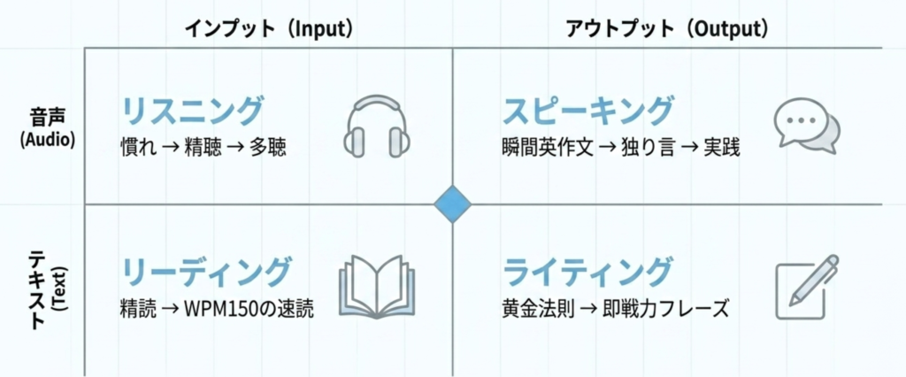 英語の『基礎』が作れたら、ここからは徐々に今の自分にとって必要な技能を鍛えていきます。