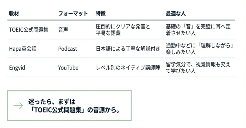 ここからは、聞き流しに適切なリスニング教材を3つ厳選してご紹介していきます。