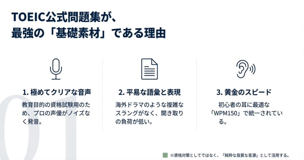 TOEICの音源内容は語彙・表現が比較的平易なものが多く、海外ドラマや映画などの速く難しい素材を使うよりも聞き流しの効果が見込めます。