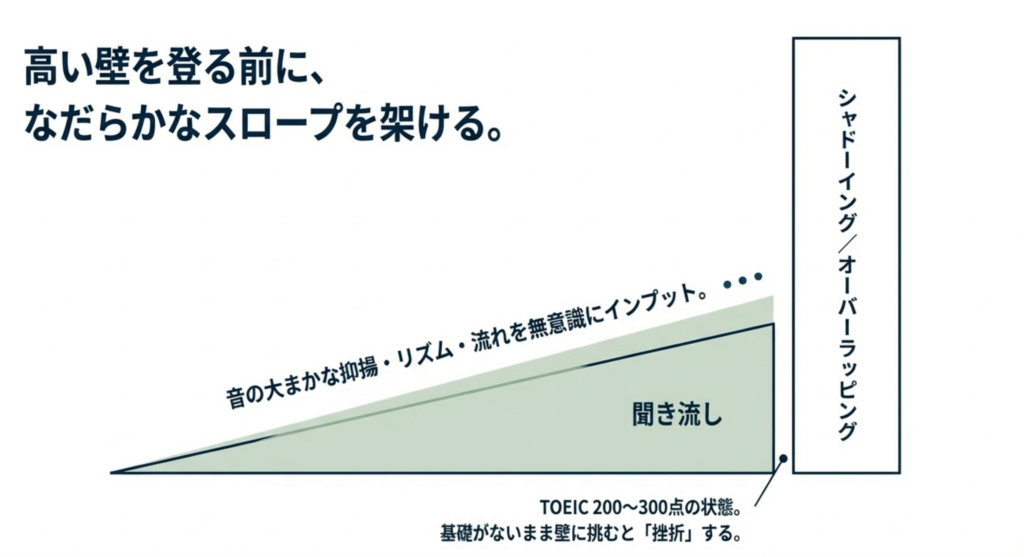 なぜなら0の状態だと、リスニング力を鍛える専門的な方法であるシャドーイングやオーバーラッピングを適切に行うことができないレベルだからです。