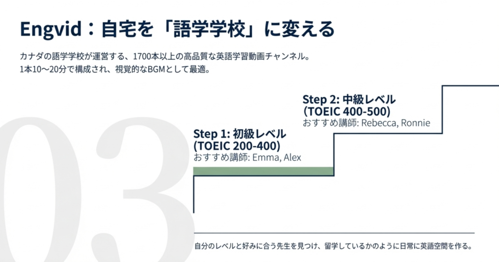 数あるYoutubeチャンネルの中で『Engvid』を聞き流し用におすすめする理由は、「レベル別にチャンネルが分けられている」からです。