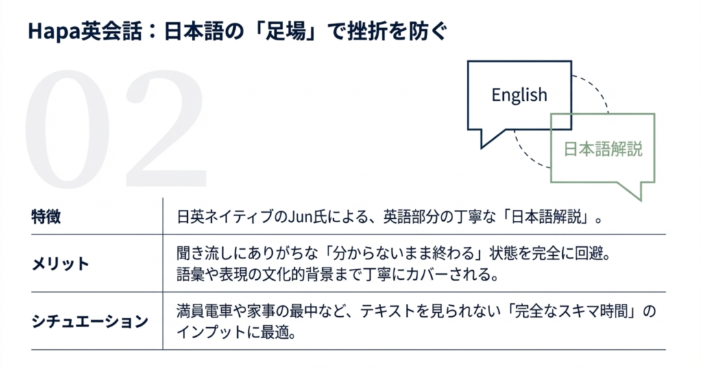 『Hapa英会話』のおすすめポイントは、日本語での解説が入っている、語彙・表現の説明が丁寧という点です。