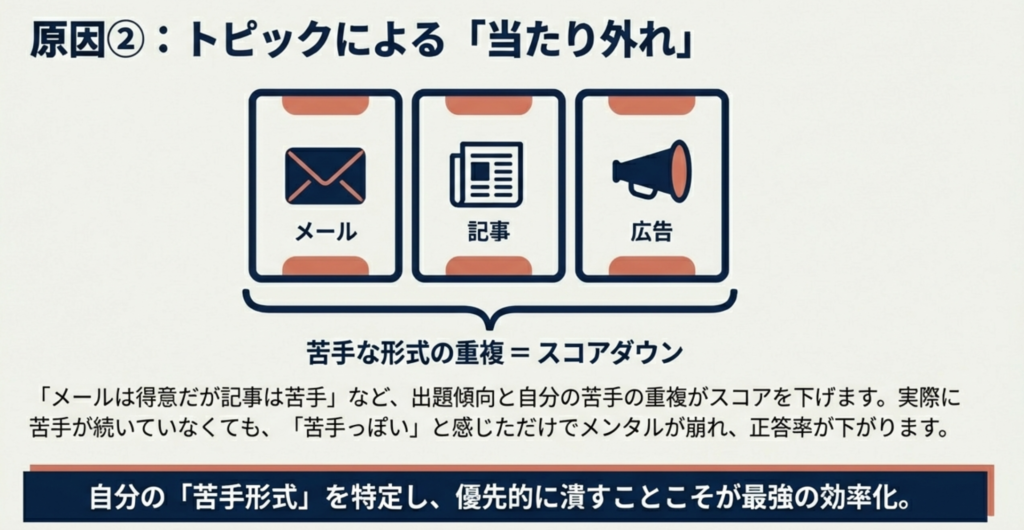 つまり、自分が「苦手だな」「集中力を阻害されるな」と思った部分を優先的に改善していくことで、登場するトピックによって点数を変動させないような力がついていくことになります。