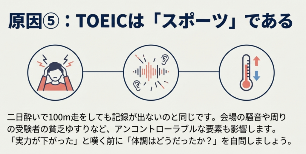 TOEICで点数が落ちる5つめの原因は、体調・環境・メンタルに点数が依存するテストであるからです。
