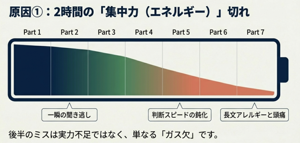 そして、この「集中力」が低下していくことによってTOEICの試験中には下記のような試練が起こります。