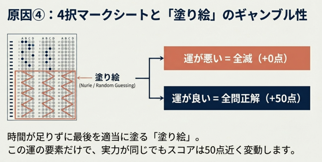 仮に10問終わらず「塗り絵部分」が全て不正解だった場合と、ランダムに選んだけど全て正解だった場合を比較すると(これは極端ですが)、50点程度点数が変わってしまう可能性がありますよね。