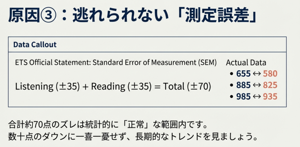 TOEICで点数が落ちる3つめの原因は、テストの測定誤差が存在するからです。