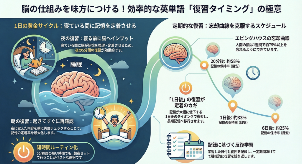 夜に復習して、朝に起きたときに再度復習という形で学習すれば定着率は最大化されていきます。ちなみに、この復習は5分程度でも効果がしっかりあるので、夜と朝には単語の復習、というルーティンを創り上げることはベストな選択です。
