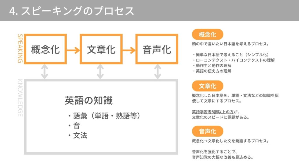 下記の画像のようにスピーキングとリスニングだけで分解してみると、全ての技能について語彙が密接に関わっていることがよくわかります。