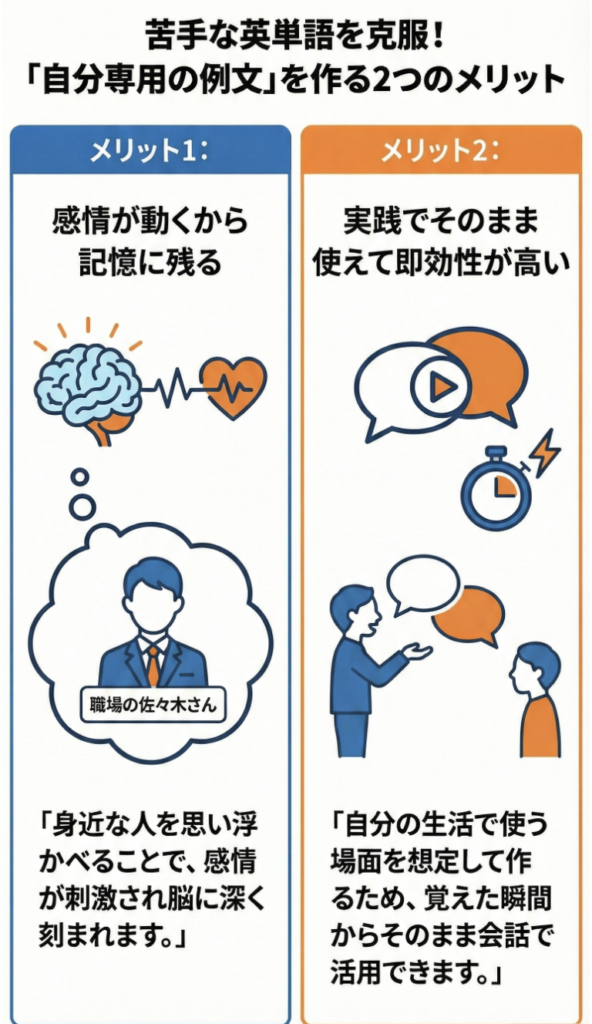 2. 単なる例文作成で終わらず、ユーザーの感情を動かし、記憶に深く刻み込む。