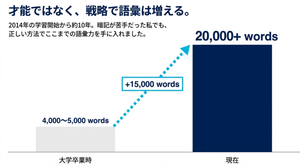 私は2014年から英語学習を開始し、9-10年間で「約20,000語以上」の単語を覚えることができました。
