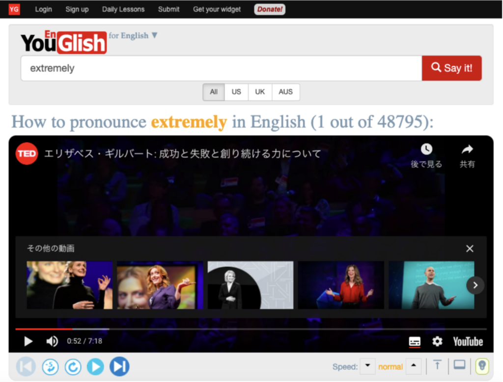 このサイトの上部に設置されているサーチエンジン枠に単語を入れてみると「その単語が動画内で使用されているYoutube動画が一瞬で」検索されます(すごすぎる!)⇩先ほど登場した「extremely」で検索してみました。