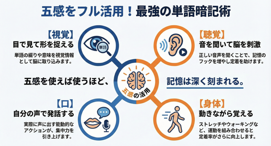 これは、単語帳などで学習する際、ただ目でみるだけでなく、「音を聞く」「自分で発話する」「運動をしながら覚える」など、五感を最大限活用するという方法です。