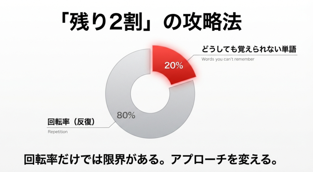 ちなみに単語を覚えるためには回転率を上げて徹底的に繰り返すことが効率良いですが、それで覚え切れるのは7-8割の単語です。残り2-3割の単語に対しては下記のような特別なアプローチをとっていくことで効果的に覚えることができます。