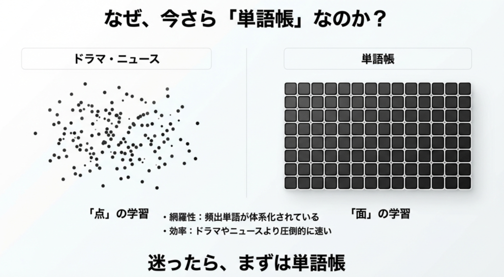 理由としては、単語帳の場合単語が網羅的に掲載されているため、一度でまとめて多くの単語を覚えることができるからです。
