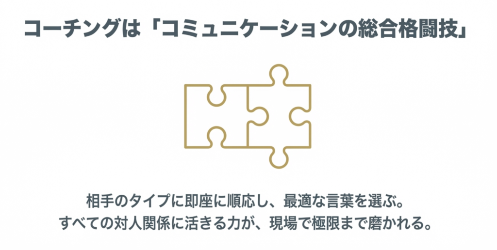 コーチングは「コミュニケーションの総合格闘技」なので、ありとあらゆるスキルが身につくということは日々実感しています。