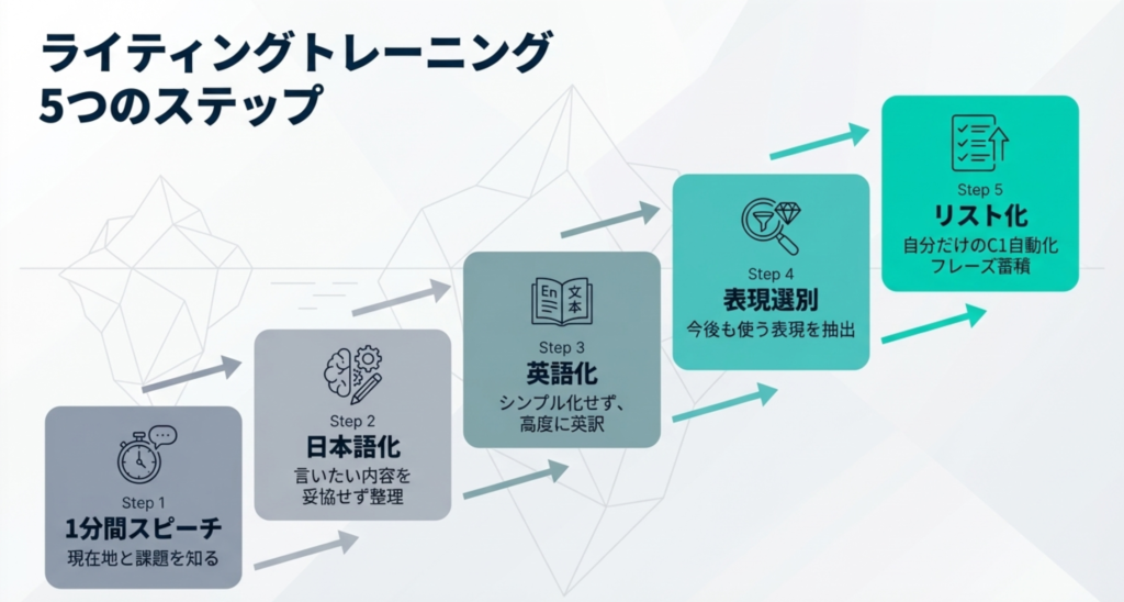 ✔ ライティングで概念化と文章化を分解して鍛え、WPM(流暢性)とLU(語彙力)を同時に向上させることを目指す