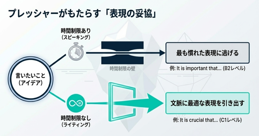 さらに深刻なのは、相手がいることによる心理的プレッシャーです。このプレッシャーが、新しい表現や語彙を試す機会を奪ってしまいます(「伝えなきゃ!」という気持ちが優位になる)。